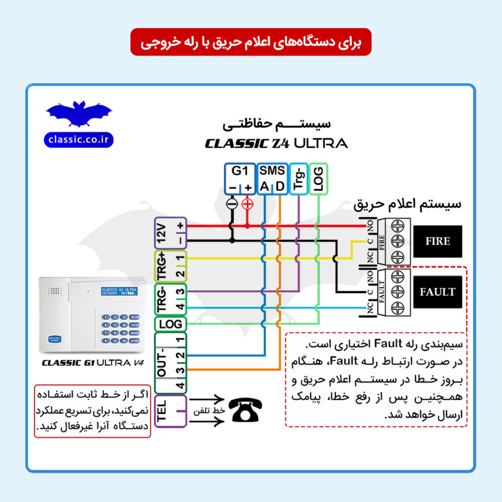 تلفنکنندۀ کلاسیک G1Ultra میتواند آلارم حریق و همچنین بروز خطا (Fault) در سیستم اعلام حریق را به شما اعلام کند. تلفن کنندۀ را میتوان به طور مستقل به سیستم اعلام حریق وصل کرد و یا به صورت همزمان به سیستم حفاظتی واعلام حریق ارتباط داد. بر این اساس و با توجه به اینکه سیستم اعلام حریق ممکن است رلۀ خروجی نیز داشته باشد یا خیر، چهار روش برای سیمبندی پیشنهاد میشود که در ادامه به آنها میپردازیم.